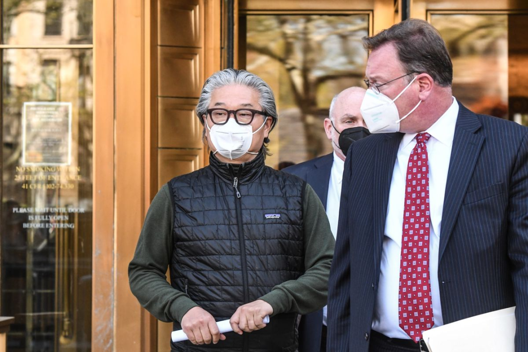 身着Patagonia老頭背心的Bill Hwang離開紐約法院.Bloomberg
