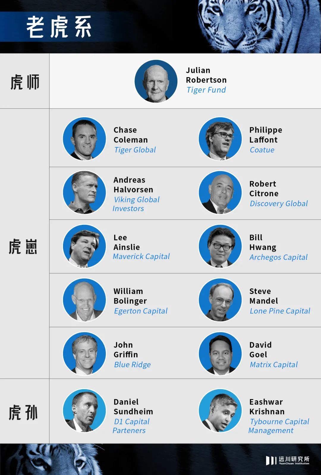 此時,羅伯遜決定以一種急流勇退的方式來保住晚節:用清盤所得的15億美元為徒弟們提供初始資金,購買他們基金的股份,就像在老虎基金一樣指導他們組建網絡、分享研究 [7]。有着羅伯遜「華爾街超級名片家」的人脈網絡,也一定程度解決了幼虎們創業初期募資、管理以及辦公場地的問題。