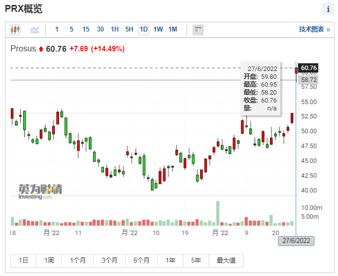 截至發稿,在荷蘭阿姆斯特丹上市的Prosus股價大漲近15%,報60.76歐元/股,顯然此次回購也起到了提振股價的作用。