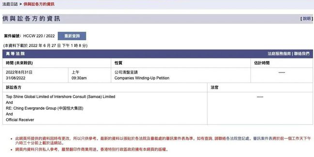 6月27日,據香港司法機構網站公告,Top Shine Global Limited of Intershore Consult (Samoa) Limited已於香港高等法院向中國恆大集團提出清盤呈請。案件編號為HCCW 220/2022,聆訊時間定於2022年8月31日上午9:30。