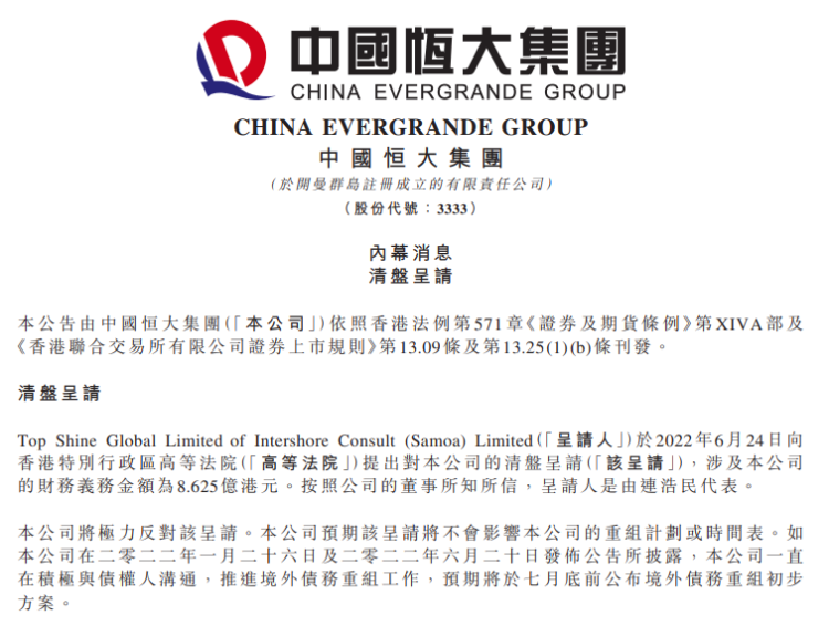 2022年6月28日早間,中國恆大發布公告稱,Top Shine Global Limited of Intershore Consult(Samoa)Limited(呈請人)於2022年6月24日向香港特別行政區高等法院提出對本公司的清盤呈請,涉及債權金額為約8.625億港元。
