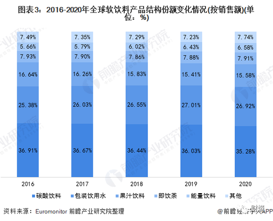 另據Euromonitor數據顯示,2016年至2020年,全球碳酸飲料的佔比,從2016年的36.91%下降到2020年的35.28%。對比之下,包裝飲用水、果汁、能量飲料等非碳酸飲品,正在成為人們的新選擇。