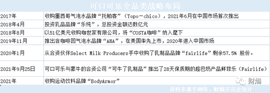 2014年,可口可樂在中國大陸推出輕補給品牌「水動樂」;2018年,可口可樂在中國大陸推出無糖茶飲料品牌「淳茶舍」;2019年,可口可樂在我國推出茶飲料品牌「陽光」;2021年6月,可口可樂在中國市場首次推出含酒精飲料「託帕客硬蘇打氣泡酒」,8月又在線上開了一家專賣植物基飲料的「植白説旗艦店」,9月推出了一款低度風味酒飲——「檸檬道」日式檸檬氣泡酒;此外,可口可樂還與蒙牛(02319.HK)的合資企業可牛了乳製品有限公司推出「鮮菲樂」品牌,進軍低温奶市場;2022年6月,可口可樂推出夏枯草涼茶。