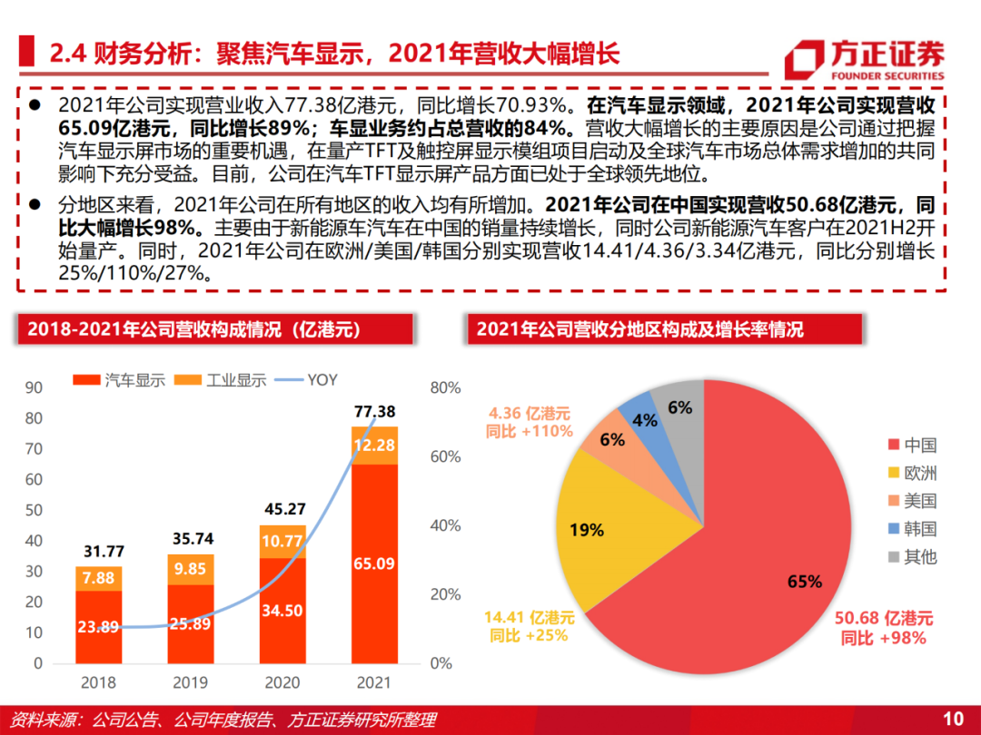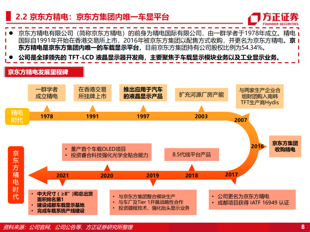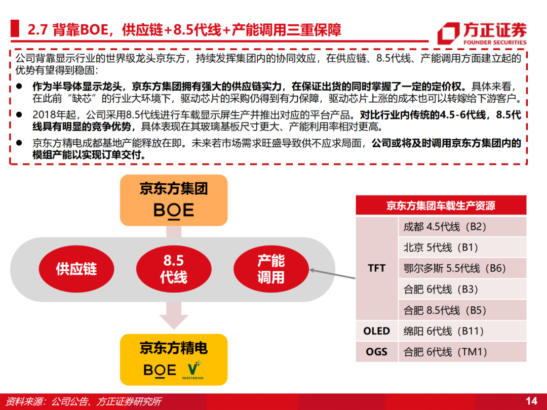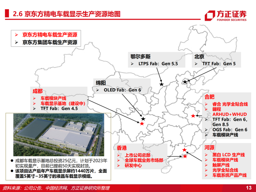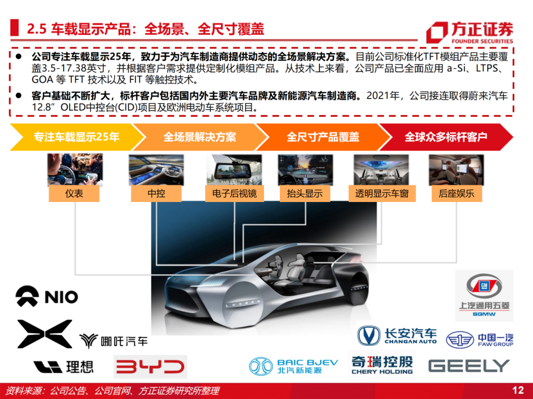 公司專注車載顯示25年,車載屏革命引領者厚積薄發。在2016年被京東方集團收購之后,公司成為集團內唯一車載顯示平臺,車載顯示產品全場景、全尺寸覆蓋。根據Omdia統計,2021年京東方車載事業中大尺寸(≥ 8」)TFT面板出貨量保持全球第一,同時總出貨面積躍居全球第一。成都車載顯示基地已提前50天實現封頂,項目達產后可年產車載屏約1440萬片,全面覆蓋5-35英寸車顯模組。公司背靠世界級顯示龍頭,供應鏈、8.5代線、產能調用三大優勢有望持續穩固。