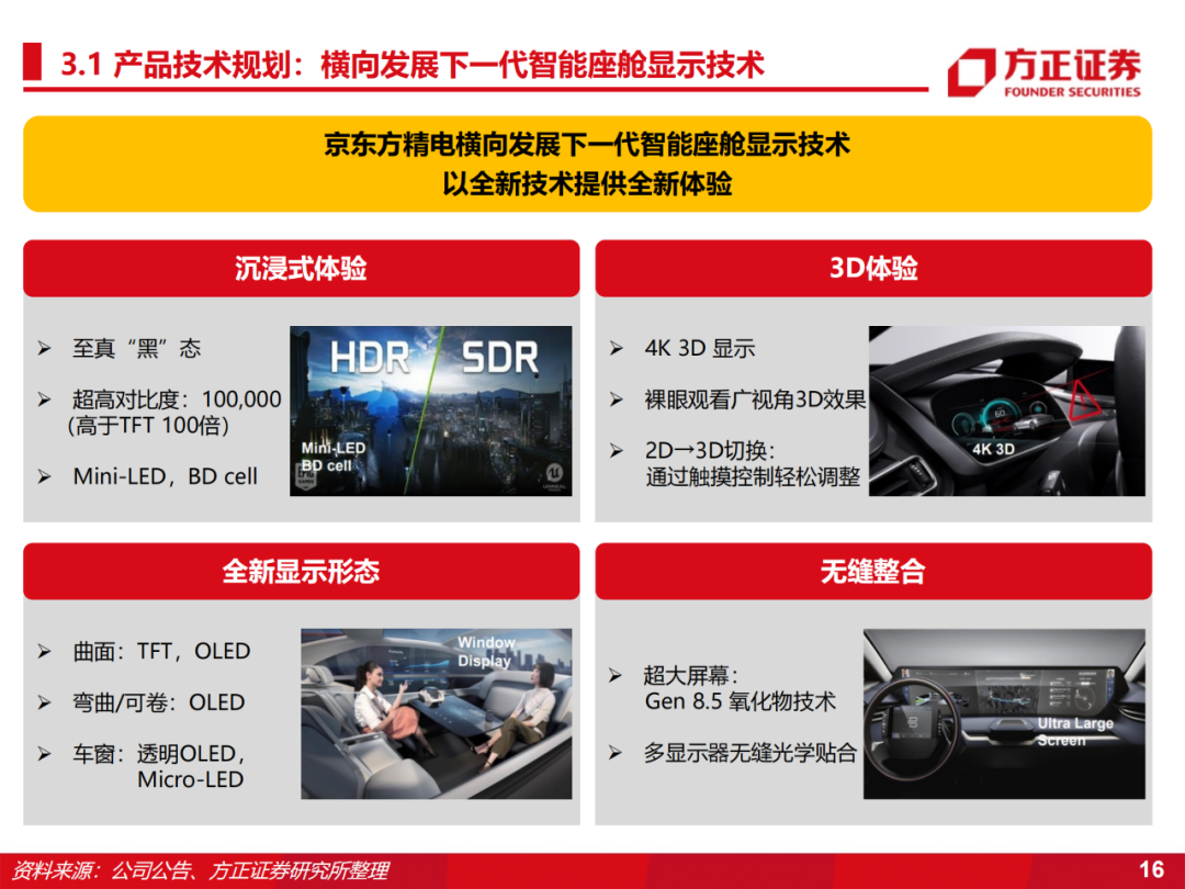 橫向發展智能座艙新顯示,縱向延伸車顯系統業務。公司現有儲備 Mini/Micro LED、BD cell 等新顯示技術及曲面、可卷等新顯示形態,以全新技術催化全新體驗。座艙域發展呈現「屏機分離」趨勢,產業鏈關係有望重塑。公司目前仍立足於Tier 2的器件供應商角色,長期來看有一定機會將業務延伸至車載顯示系統和智能座艙解決方案。