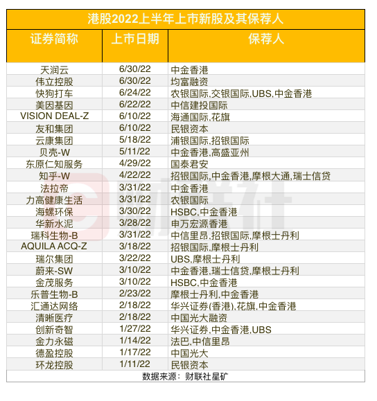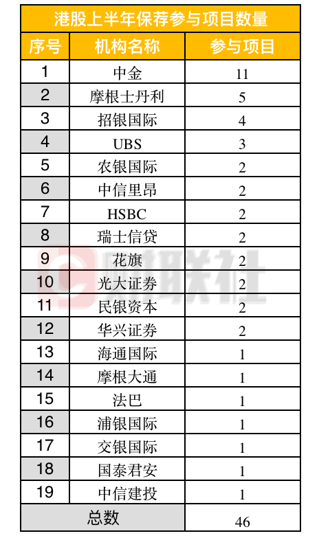 上半年包括2家SPAC企業在內的26只新股當中,中金參與了其中11家的保薦工作,成為今年上半年承擔最多港股新股保薦工作的投行。當中天潤雲與意大利遊艇企業法拉帝為中金獨家保薦,其余9家為聯席保薦,且今年的聯席保薦項目,並未有哪家機構與中金多次聯合保薦。