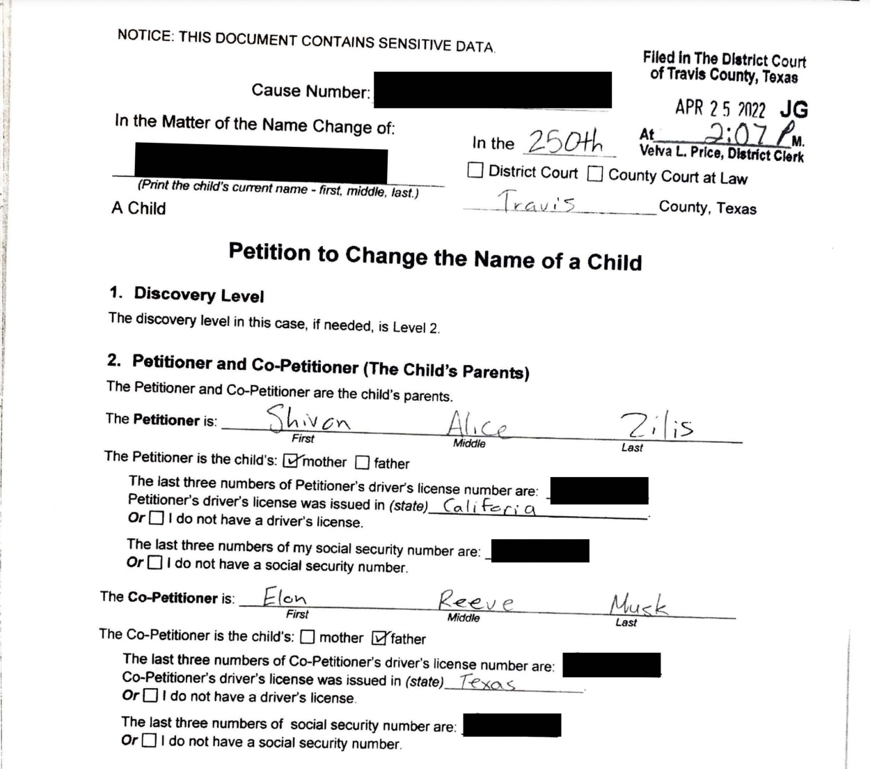 文件顯示,4月,馬斯克和Zilis提交了一份請願書,要求將這對雙胞胎的名字改為「使用他們父親的姓氏」,並將他們母親的部分姓氏作為中間名的一部分。德克薩斯州法院於5月批准了該請求。