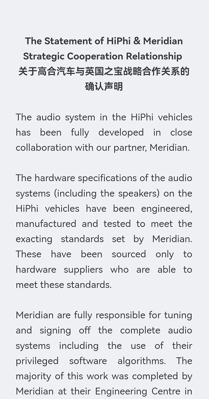 根據2021年初的一份新聞稿,高合汽車當時宣佈,「旗下HiPhi X 已於2021年初遠赴英國劍橋,聯手全球頂級豪華汽車品牌御用音響Meridian英國之寶完成其沉浸式座艙內全球首個可進化數字音響系統的調音工作。本次調校由高合汽車與Meridian英國之寶首席車載音響調音師Michael Cousins博士帶領的專業調音團在Meridian英國之寶總部聯合完成。並且基於HiPhi X的H-SOA超體電子電氣架構,調校好的音響系統未來還能通過OTA升級不斷進化,為用户帶來更為卓越豐富的音效體驗。」