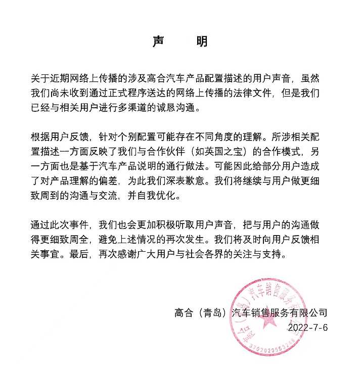 其中,第一條引發的反響最大。對此,高合汽車發佈聲明稱:根據用户反饋,針對個別配置可能存在不同角度的理解。所涉相關配置描述一方面反映了公司與合作伙伴(如英國之寶)的合作模式,另一方面也是基於汽車產品説明的通行做法。可能因此給部分用户造成了對產品理解的偏差,「為此我們深表歉意。我們將繼續與用户做更細緻周到的溝通與交流,並自我優化。」