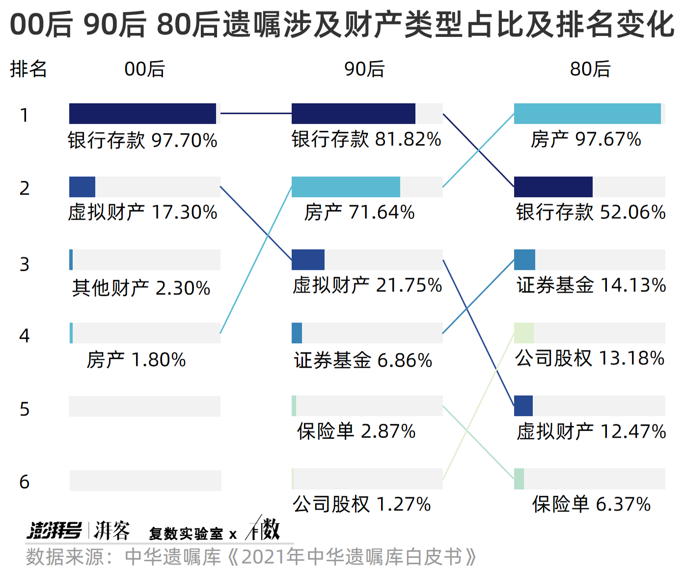 2021年,中華遺囑庫所保管的29253份遺囑顯示,對數字遺產的重視是00后、90后與80后的一大區別。數字遺產分別佔據00后與90后關注要素的第二位與第三位。