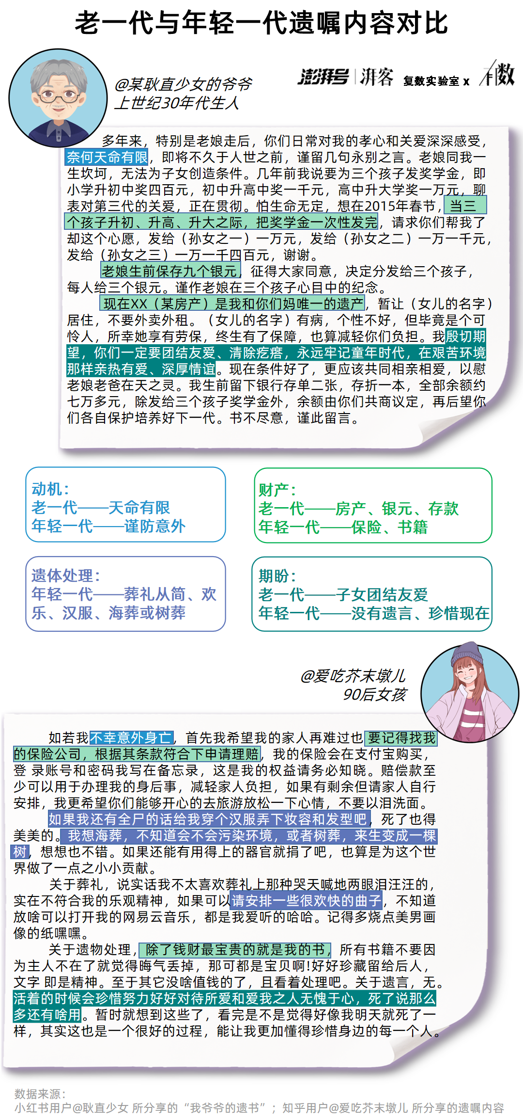 對比以下兩位網友在社交媒體上公佈的兩則遺囑,不難看出老年人與年輕人在撰寫遺囑時迥異的關注點。