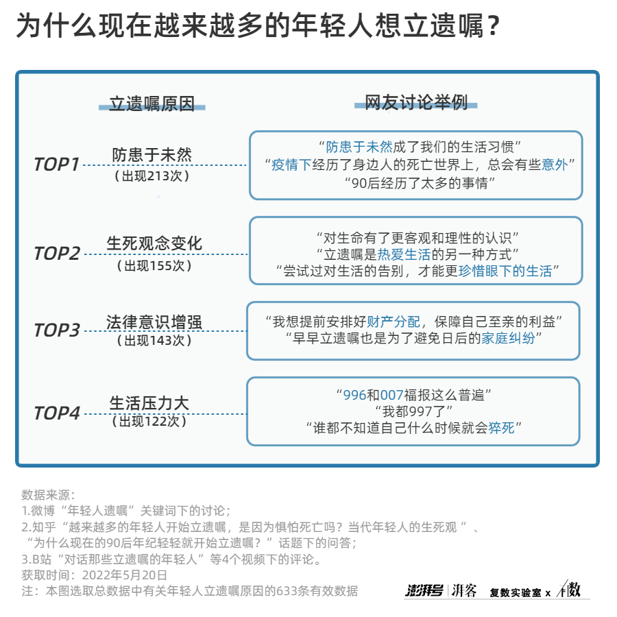 產生過此類念頭的,不止小郁一個人。在社交媒體上,年輕人並不諱談自己在大好年華就想要立下遺囑的原因。