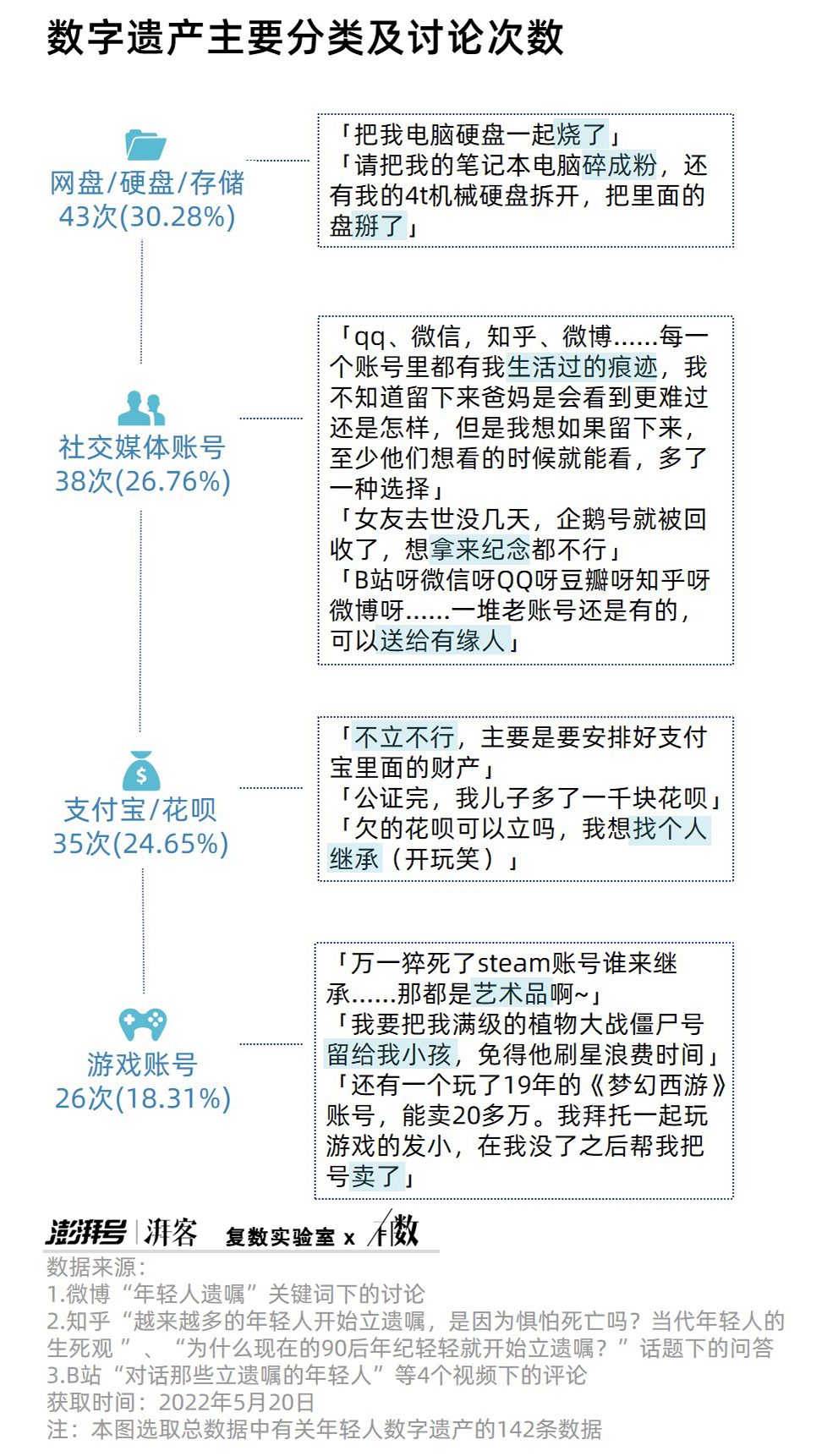 所謂數字遺產或虛擬財產,主要可分為「社交媒體賬號」「支付寶/花唄」「遊戲賬號」與「網盤/硬盤/存儲」四類。