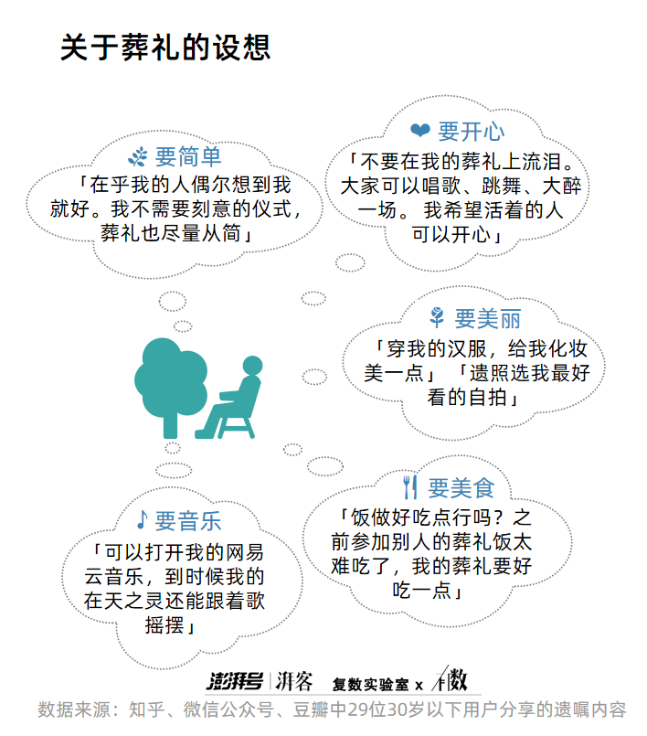 對90后和00后而言,葬禮的背景音樂一定要是自己愛聽的,葬禮的飯也不能隨隨便便。此外,他們還希望能夠「美麗地離開」。即使是在生命的「最后一程」里,這一代年輕人也不忘追求浪漫。