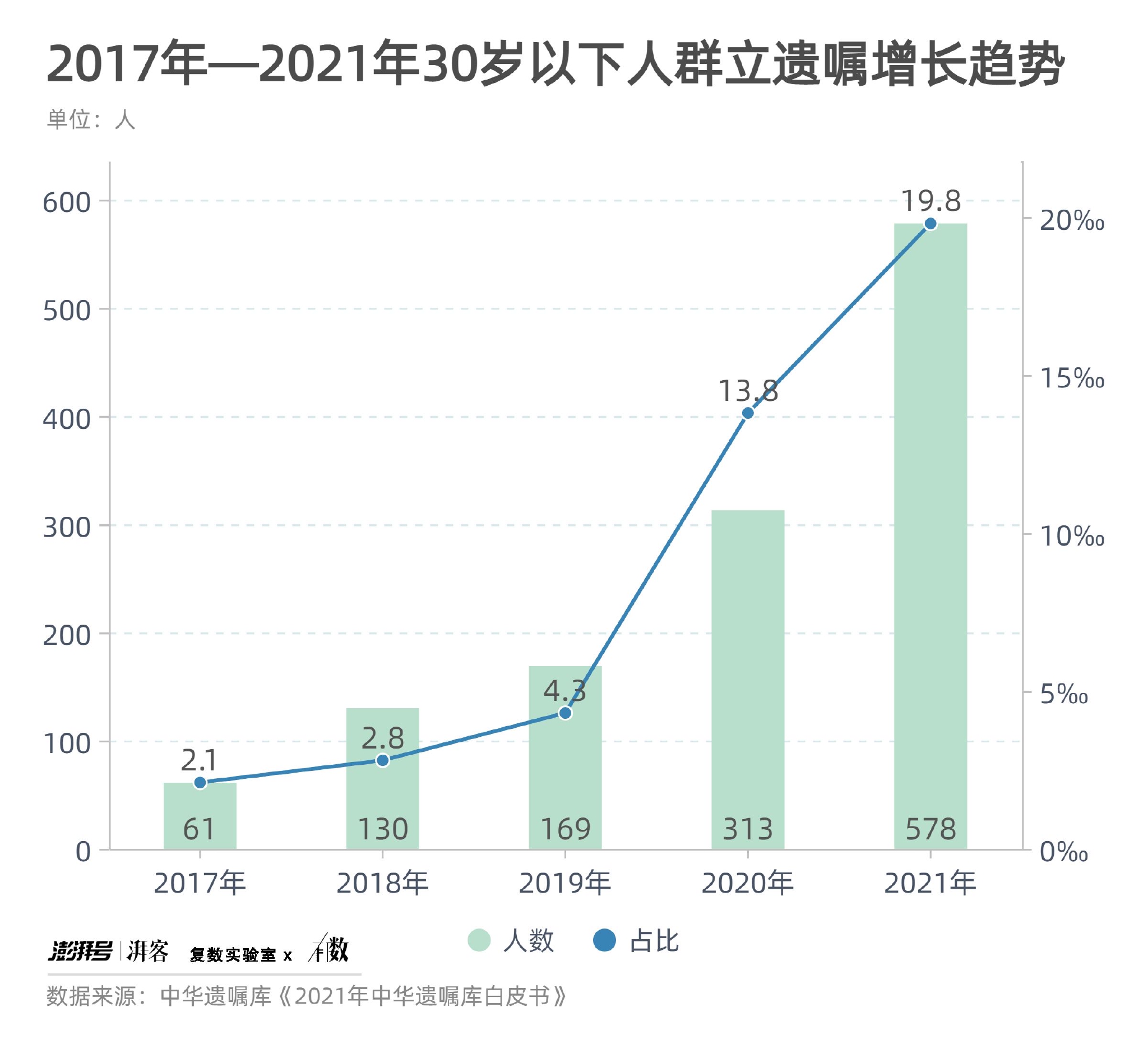 根據今年3月發佈的《2021年中華遺囑庫白皮書》,從2017年到2021年的五年間,每年各有61、130、169、313、578位30歲以下的年輕人來到該機構訂立遺囑,在數量與佔比上都顯著增長。