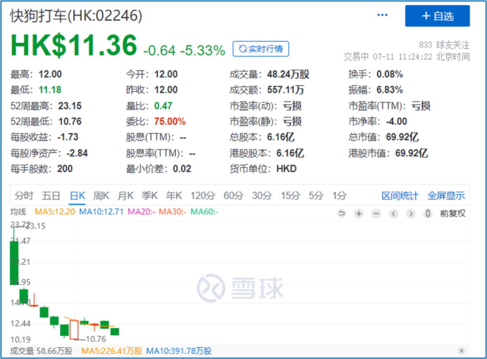 截至7月11日,快狗打車的市值為69.9億港元(約合59.78億元人民幣)。這個數字意味着,快狗打車IPO前進入的大部分風投以及IPO時的國際投資人、基石投資人和二級市場投資人全部虧損慘重。