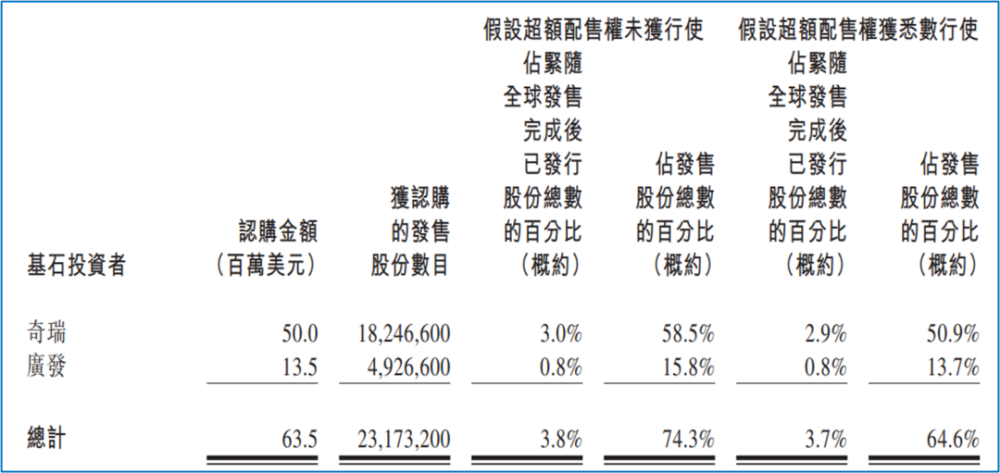 需要指出的是,國際發售部分包括基石投資者認購部分。根據快狗打車披露信息,快狗打車此次的基石投資者為奇瑞和廣發,一共認購了6350萬美元,其中,奇瑞認購5000萬美元,廣發認購1350萬美元,分別認購股份1824萬股和493萬股,合計認購2317萬股,佔全球發售總量的74.3%。