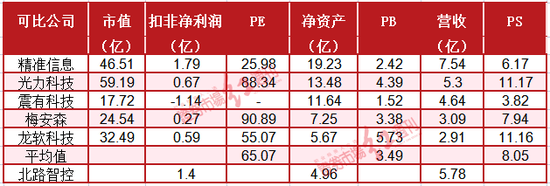北路智控招股書選取精準信息、光力科技、震有科技、梅安森、龍軟科技等五家公司作為可比公司,我們用它們作為估值參考。選用PE、PB、PS三種相對估值法;市值選取2022年7月8日收盤數據,財務數據選取2021年報數據。