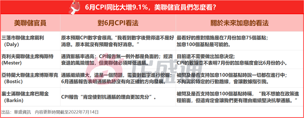 1、6月CPI「破9」,美聯儲官員們看法如何?