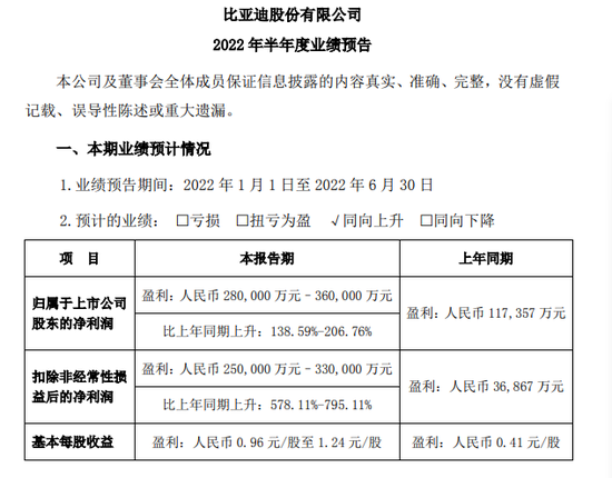 陷入股神巴菲特拋售傳聞的比亞迪,剛剛更新了一份並無太大驚喜的2022上半年業績預告。