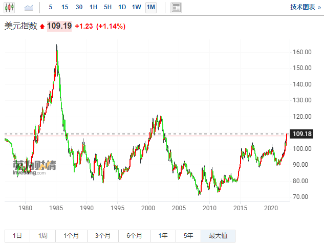 華盛資訊7月14日消息,周四美股開盤后,美元指數再破近20年新高,截至發稿漲1.14%,報109.19。與此同時,大宗商品表現弱勢,WTI原油期貨跌超5%,考驗90美元/桶關口,回吐俄烏衝突以來的漲幅。黃金期貨跌超2%,白銀期貨跌超5%。