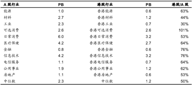 按照一級行業觀察,目前港股的一級行業平均估值幾乎是A股50%。其中,在新經濟指數聚焦的幾個行業中,信息技術的平均估值是A股的76%;日常消費行業的平均估值是A股的53%,可選消費與A股基本接近,醫療保健是A股的64%,工業僅為A股的30%。