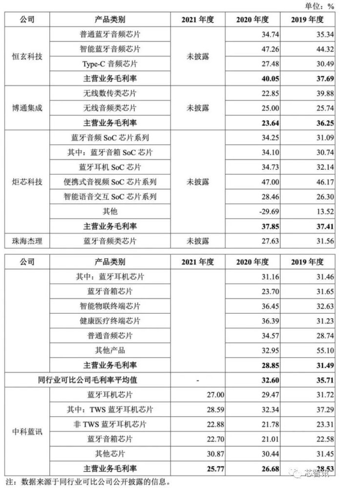 具體營收方面,2019 年至 2021 年,中科藍訊的營收分別為 6.46 億元、9.27 億元、11.24 億元,年複合增長率為 31.85%,淨利潤為 1.49 億元、2.15 億元、2.29 億元。雖然營收及淨利潤持續增長,但是中科藍訊的毛利率低於同行業可比公司平均水平,同行業可比公司 2019 年、2020 年毛利率平均值為 35.71%、32.60%。