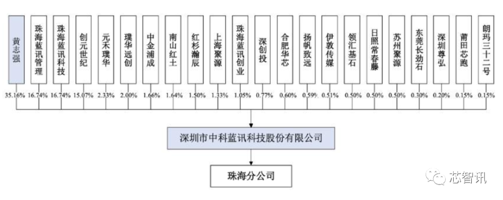 股權結構方面,中科藍訊的實際控制人為其董事長黃志強,持股 35.16%,此外,單獨或合計持有中科藍訊 5% 以上股份的其他股東為珠海藍訊管理、珠海藍訊科技、創元世紀,分別持股 16.74%、16.74%、15.07%。