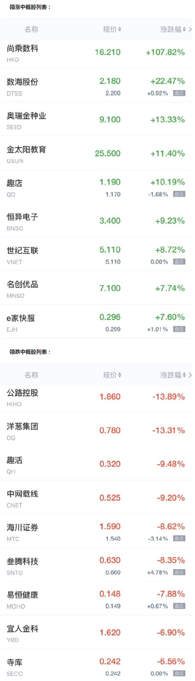 香港數字金融服務公司尚乘數科上市首日收盤飆升近108%,趣店漲超10%,世紀互聯漲超8%,名創優品漲超7%,樂居漲超7%,荔枝、萬物新生、51Talk漲超4%,優信漲4%,小牛電動、塗鴉智能漲超3%,鬥魚、金山雲漲超2%,網易有道、騰訊音樂漲近2%,知乎、新東方漲超1%,雲米科技漲近1%。