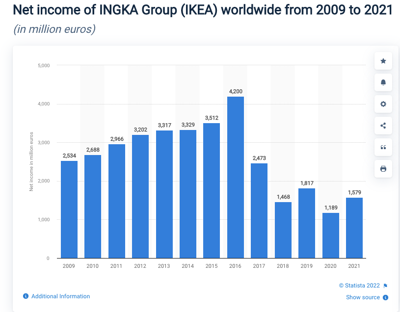 截至2019年,宜家家居在全世界的52個國家和地區中擁有433家大型門市。即便是疫情這幾年家俱行業遭受寒冬,宜家的淨收入也在11-18億歐元之間。