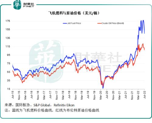 除此以外,燃料成本隨油價急漲也蠶食了航空公司的收入,尤其是2022年上半年燃料油的價格上漲幅度遠超原油。