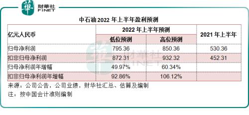 中石油預計,在其加強油氣勘探、優化產品結構推動油氣銷量的帶動下,2022年上半年歸母淨利潤將增加265億元(單位人民幣,下同)到320億元,增幅為50%到60%;扣非歸母淨利潤或較上年同期增長420億元到480億元。