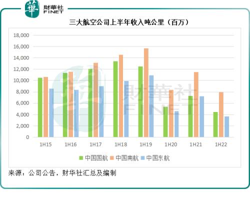 見下圖,三大航司2022年上半年收入噸公里遠低於2021年上半年的水平,甚至還低於疫情剛剛出現時的2020年上半年水平,主要因為局部疫情導致出行需求下降。