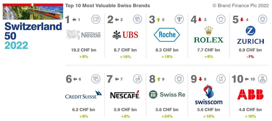 英國品牌評估機構「品牌金融」(Brand Finance)發佈「2022瑞士品牌價值50強」排行榜(Schweiz 50 2022)。雀巢、瑞銀、羅氏名列前三位。