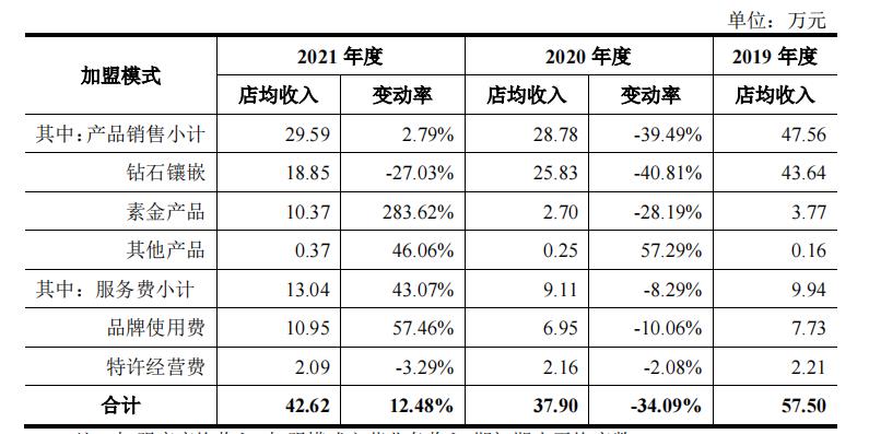 比如,2021年,加盟模式下的素金產品毛利率僅2.27%,但在電商模式下的毛利率為24.97%,自營店模式下為25.35%;加盟模式下的鑽石鑲嵌產品毛利率僅為16.69%,而電商模式下為41.34%,自營店模式下為56.81%。