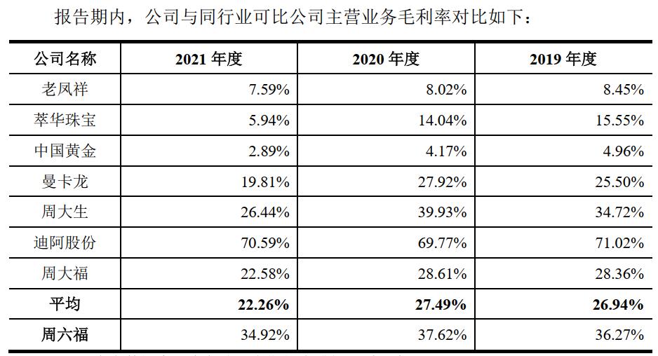 毛利率較高的加盟業務在收縮,也進一步壓低了周六福的整體毛利率表現,報告期內,周六福主營業務毛利率分別為36.27%、37.62%及34.92%,呈現下降趨勢。