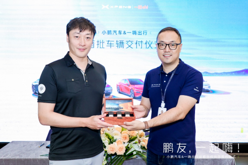 一嗨出行副總裁唐宇鈞(左)與小鵬汽車大客户管理部總經理李逢金交接車鑰匙