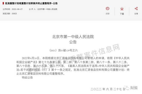 6月24日匯源果汁重整方案獲得通過