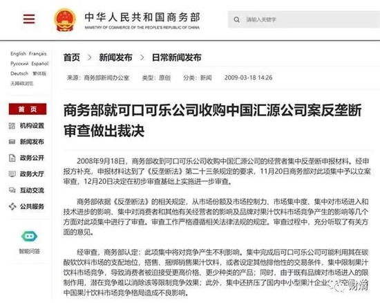 爲了促成可口可樂收購,匯源一邊舉債擴產,一邊裁撤營銷渠道。當時我國剛剛舉辦了北京奧運會,民族自豪感高漲。匯源企圖「賣身」外資的行為猶如一盆涼水澆在了國人心頭,朱新禮一番「當孩子養,當豬賣」的言論更是加劇了爭議。一時間,對匯源反併購的聲音不絕於耳。2009年3月28日,商務部以「反壟斷」為由叫停了這樁併購案。