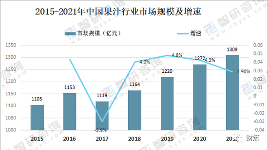 雖然與競爭對手相比,匯源的產業鏈是一大優勢,但果汁賽道整體趨於收縮是一個不容忽視的問題。據前瞻產業研究院顯示,中國果汁市場零售量增速一路減緩,近年來都是5%不到,甚至在2017年一度出現了負增長。2021年中國果汁行業市場規模為1309億元,同比增長2.9%。