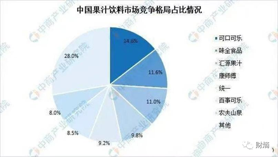 據中商產業研究院2022年1月發佈的數據顯示,目前我國果汁飲料行業中市場份額前三的企業分別為可口可樂、味全食品、匯源果汁,佔比分別為14.6%、11.6%、11.0%,匯源已落至第三。此外,康師傅(00322.HK)、統一(00220.HK)、百事可樂(PEP.NASDAQ)以及農夫山泉(09633.HK)等也緊隨其后,佔比分別為9.8%、9.2%、8.5%、8.0%。