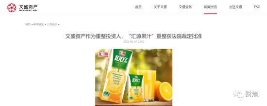 2022年6月27日晚間,匯源果汁在官方微信公眾號發佈消息稱,經北京市第一中級人民法院裁定批准,上海文盛資產管理股份有限公司(下稱「文盛資產」)將作為重整投資人並注入16億元資金,成為匯源控股股東。