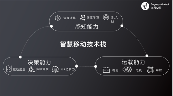 於是,九號公司將這些年圍繞邊緣計算、深度學習、SLAM技術積累下的感知能力,圍繞運動規劃、多機調度、雲邊協同積累下的決策能力,以及圍繞三電技術積累下的運載能力整合起來,搭建出如今的「智慧移動技術棧」。