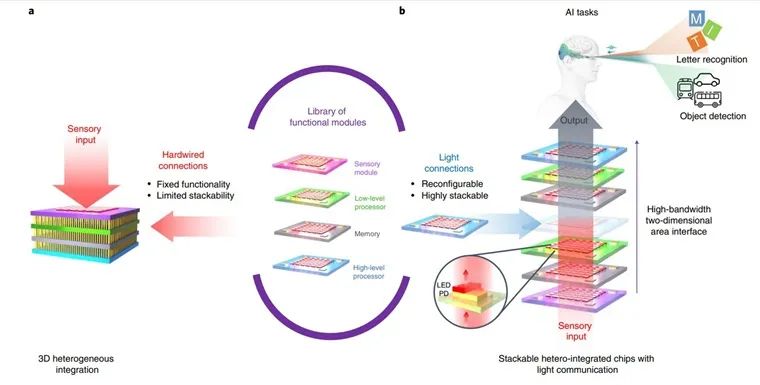 這一設計展示了可堆疊性、可替換性以及將新功能插入芯片的能力。研究人員設想製作一個通用的芯片平臺,每一層都可單獨出售;或製作不同類型的神經網絡,比如圖像或語音識別,讓客户選擇他們想要的,然后像樂高積木一樣添加到自己現有的芯片中。