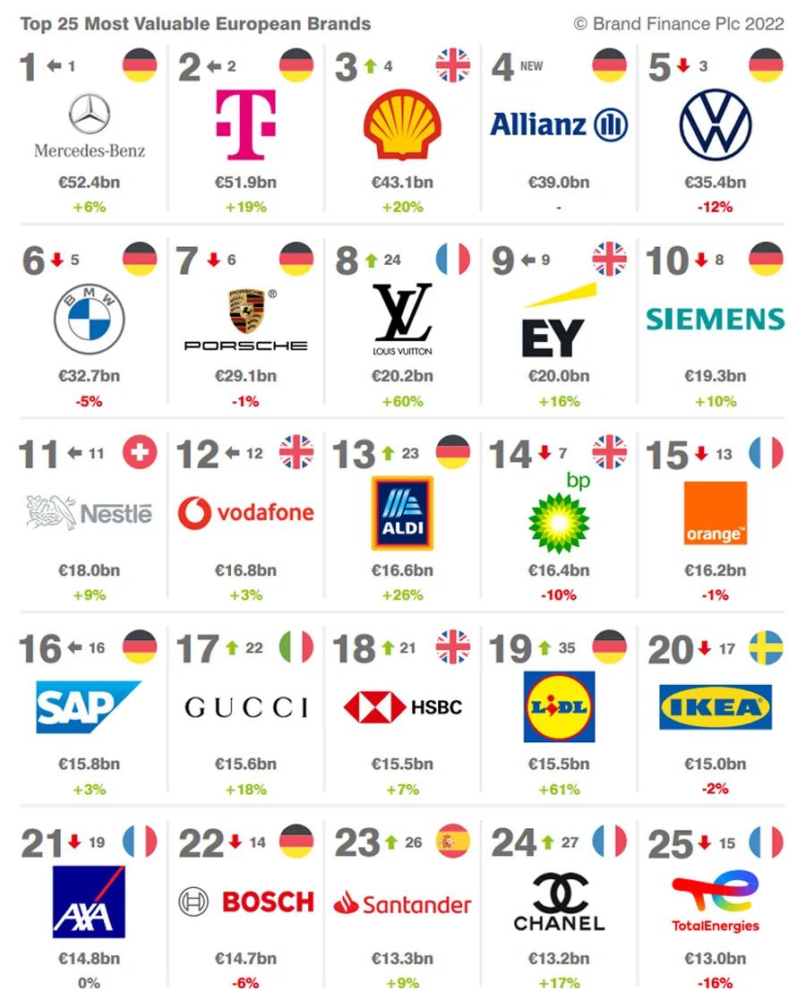 英國品牌評估機構「品牌金融」(Brand Finance)發佈《2022歐洲品牌價值500強》榜單(Europe 500 2022),品牌總價值達到19523億歐元。梅賽德斯奔馳、德國電信、殼牌、安聯集團、大眾、寶馬、保時捷、路易威登、安永和西門子名列前十。
