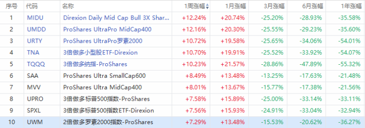 隨着美股反彈,本周漲幅居前的均為做多ETF。中型股領銜反攻,每日三倍做多中型股ETF $MIDU 全周累計上漲12.24%。小型股表現亦不錯,3倍做多小型股ETF $TNA 累漲10.7%。