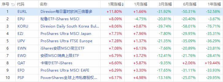 區域ETF方面,此前持續表現弱勢的歐洲市場反攻,泛歐股指表現強勢。截至周五收盤,法股、英股連續兩日收漲。每日3倍看多富時歐洲ETF $EURL 領漲區域ETF,全周累漲11.85%。歐洲國家相關ETF中,荷蘭ETF $EWN 累漲7.08%,安碩瑞典上限ETF $EWD 漲6.79%。