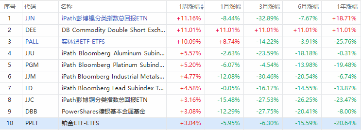 除鎳外,大宗商品鈀、鋁等同樣表現吸睛。實體鈀ETF $PALL 本周累漲10.09%,彭博鋁總報酬ETN $JJU 累漲5.57%。