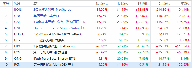 能源ETF方面,能源多頭本周賺翻了!2倍做多天然氣ETF $BOIL 全周累計上漲34.09%,美國天然氣基金ETF $UNG 周漲16.75%,彭博天然氣分類指數總回報ETN $GAZ 周漲16.27%。2倍做多標普原油與天然氣探勘與開採產業ETF $GUSH 周漲近9%。