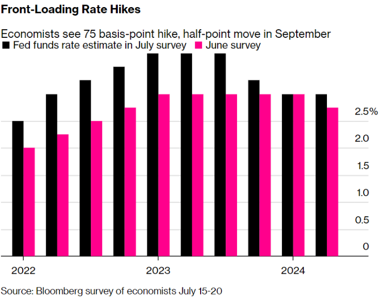據彭博的一項調查,經濟學家們預計美聯儲主席鮑威爾可能會在下周FOMC(聯邦公開市場委員會)會議上再次加息75個基點后放慢步伐。這一調查是在在7月15日至20日進行的,受訪者包括44位經濟學家。